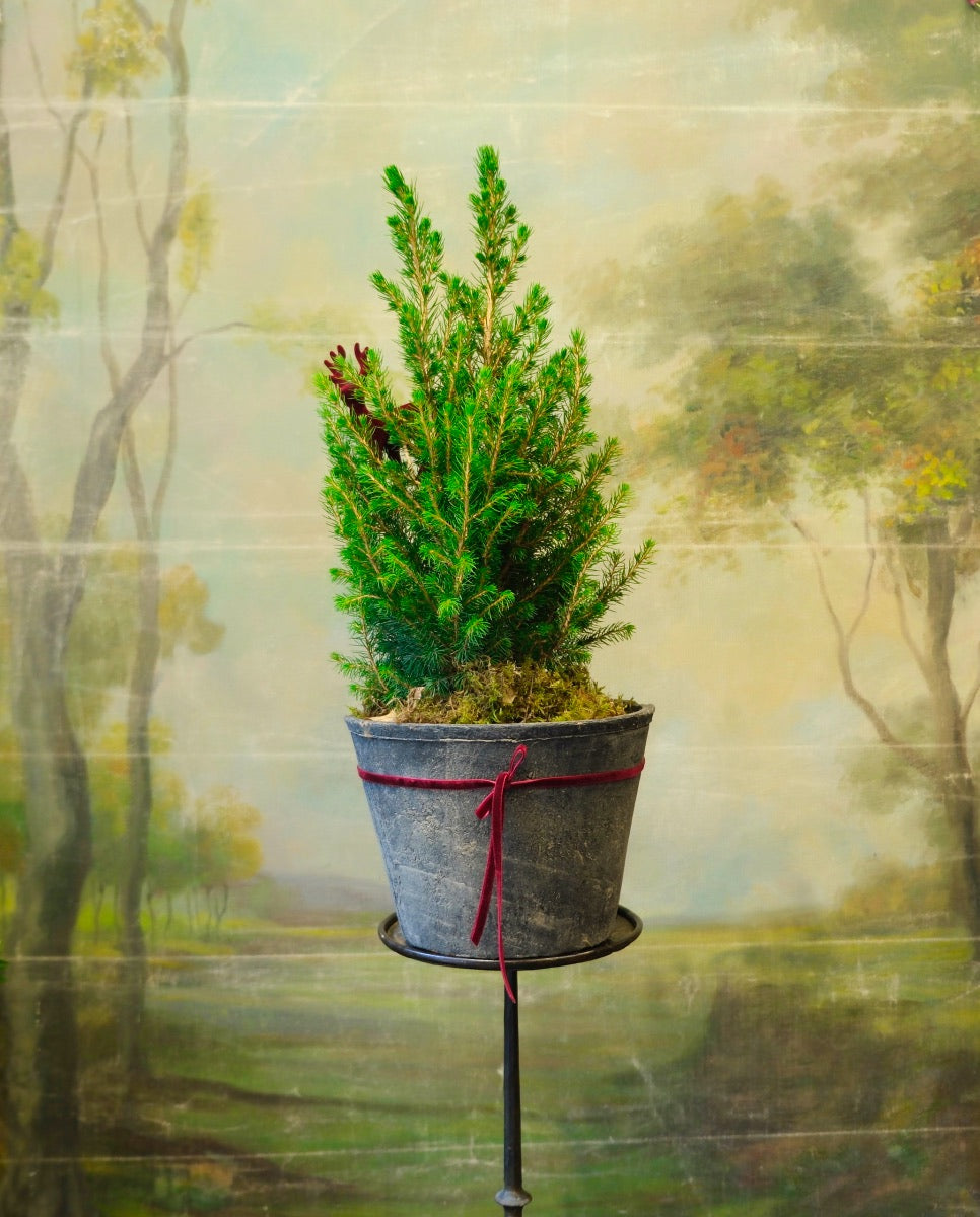 Os presentamos una bonita pieza natural de decoración para la Navidad: un abeto en una bonita maceta envejecida, que lleva una sorpresa escondida: un reno de terciopelo asoma por las ramas. Es una elegante composición ideal para decorar nuestras casas y un original regalo para cuando te invitan a cenar estos días.