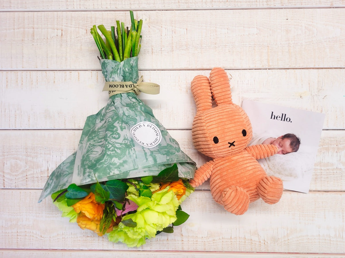 Regalo que combina la frescura de uno de nuestros ramos de flores con la suavidad de un adorable compañero de peluche Miffy de 23 cm en color salmón.