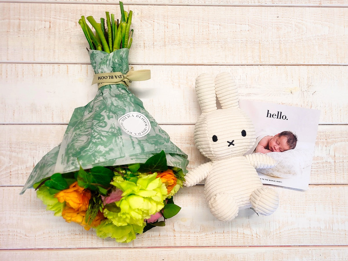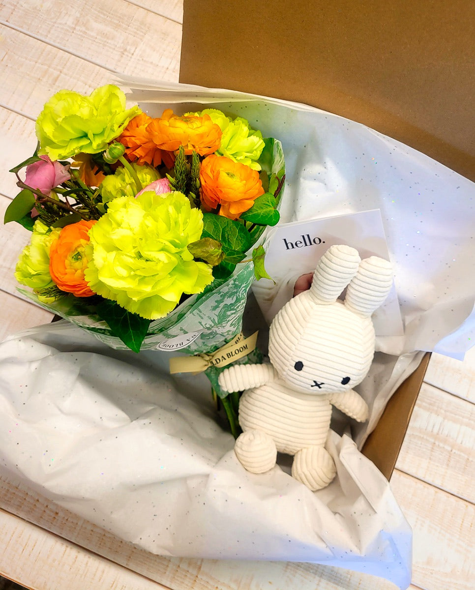 Regalo que combina la frescura de uno de nuestros ramos de flores con la suavidad de un adorable compañero de peluche Miffy de 23 cm en color blanco.