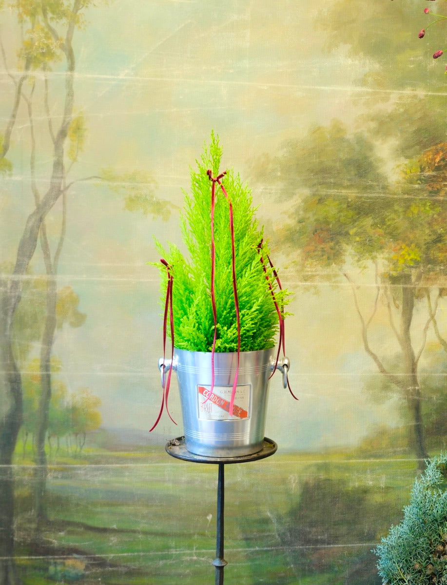 Una exquisita combinación para este centro navideño: una champanera decorada con un ciprés y lazos de terciopelo. Las champaneras con piezas únicas que provienen de brocantes y presentan signos del paso del tiempo, lo que les da un aire muy auténtico.