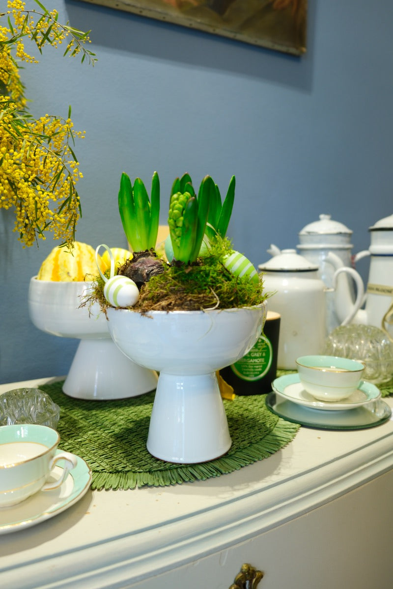 Nuestra preciosa copa Portofino con un mix de bulbos de jacinto y huevos decorativos de Pascua, un centro ideal para nuestras mesas estos días festivos y un detalle muy original para regalar si tienes que hacer un detalle para agradecer una invitación.