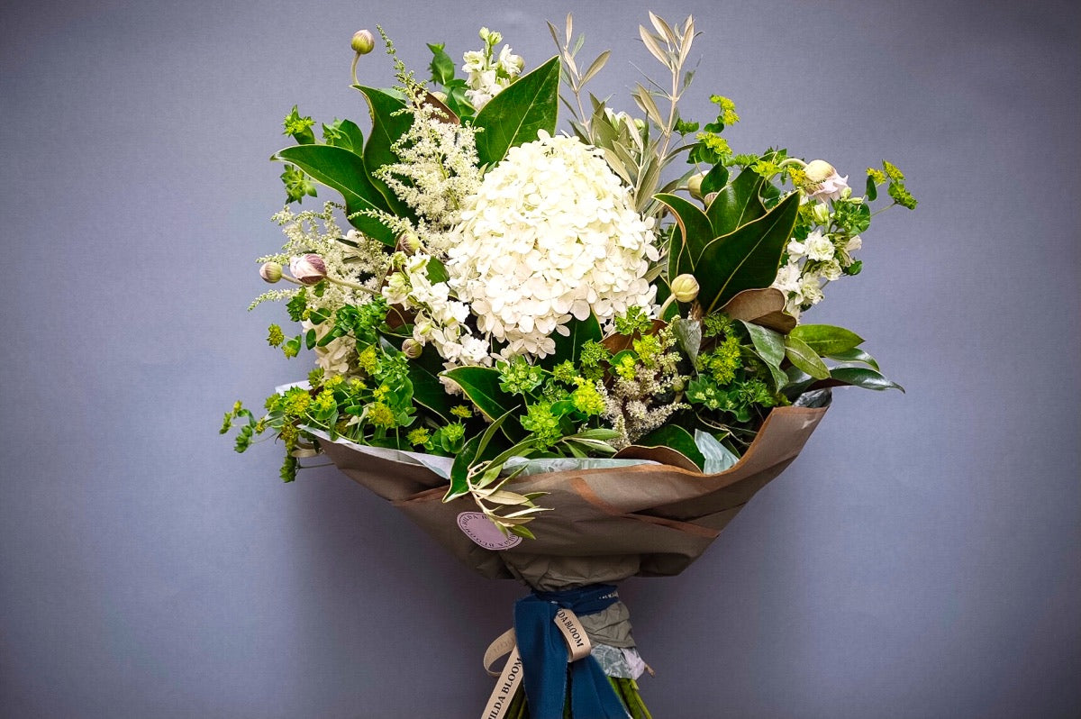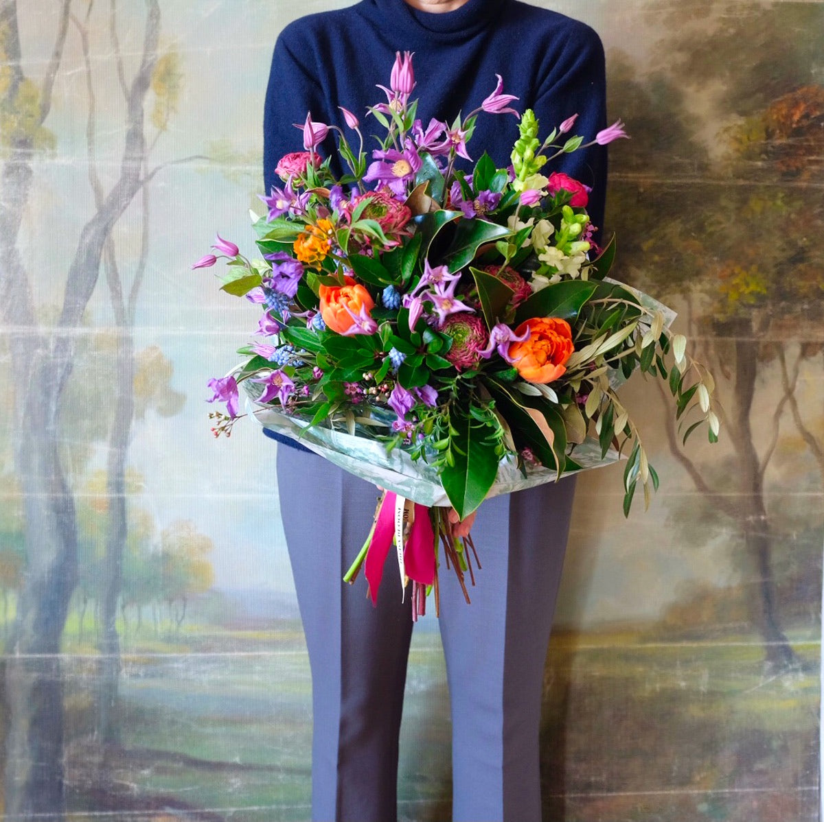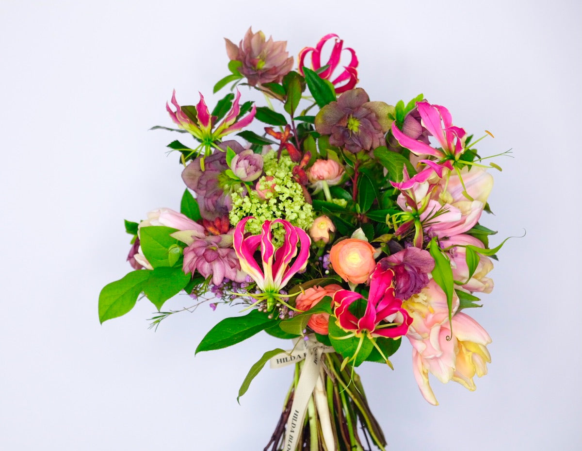 Abundancia de flores para este elegante ramo de inspiración naturalista y diseño “garden style”, con las más especiales flores de temporada, seleccionadas personalmente cada semana, en la mayor parte posible entre cultivadores locales.